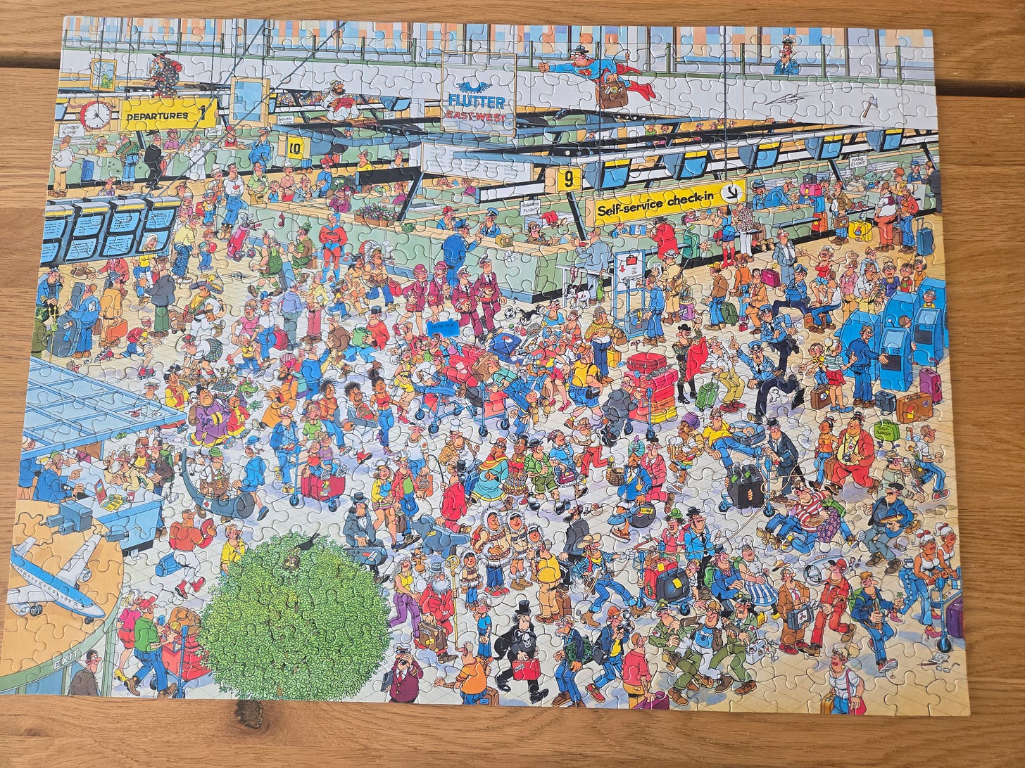I’d never done a jigsaw like this before and had always thought they were for the elderly. In fact, it turns out, they’re for people with nothing else to do. I took this one out and the 6 year old helped me with the edges, then gave up because it was too hard and I continued on by myself. Nobody interrupted me. I did it in fits and bursts over a few days. It was a cartoon scene of a busy airport (like a scene from Where’s Wally) and on the third day, David approached me and asked how it was going. “This pile of pieces is red clothes, this is blue clothes, this is feet, this is hats and this is luggage”, I said, explaining my system.