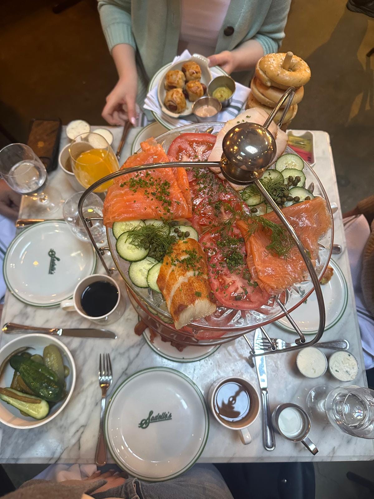 We had pigs in blankets for the table while we waited on the Sadelle’s Tower. The Sadelle’s Tower consists of smoked salmon, whitefish salad, salmon salad and sturgeon, served on three tiered plates (like afternoon tea) and comes with an unlimited supply of hot bagels, served on a tall spool (like a bagel Hoopla). All of the above was served with the precise timing, flair and fanfare usually reserved for the top table of a midlands wedding on the Platinum Package.